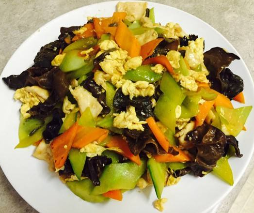 今日食堂午餐 菜品:花生小豆腐 木须肉 素炒土豆丝主食:米饭 花卷...