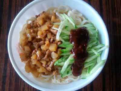 打卤面,西红柿鸡蛋卤、肉酱卤、土豆洋葱肉丁卤、黄瓜丝、小咸菜...