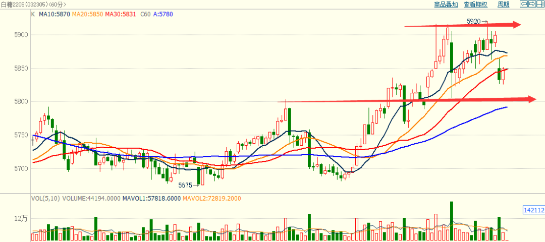 a、郑糖2205合约短线压力5880、5900,支撑5820、5800。